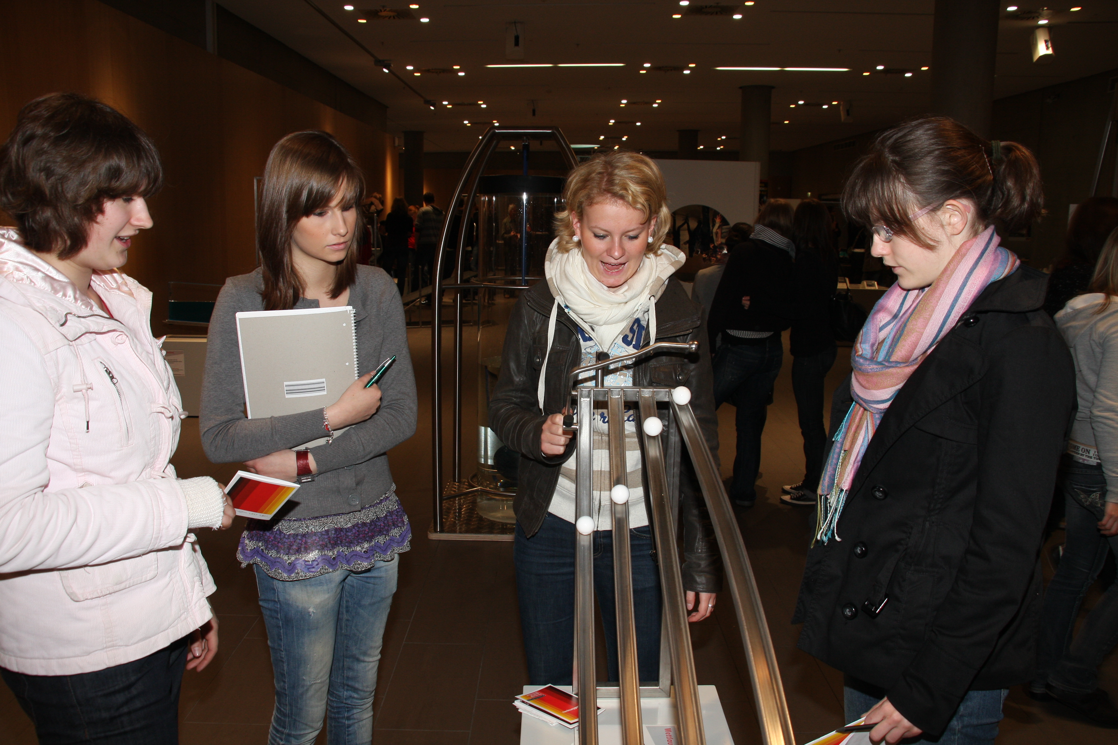Die ersten Besucherinnen der Ausstellung "Das EnergieLabor" beschäftigten sich bereits kurz nach der Eröffnung mit den "Kräften der Natur" © Wissenschaftsjahr 2009 - Forschungsexpedition Deutschland
