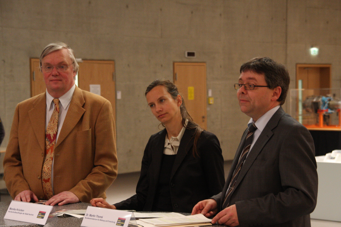 Die Eröffnung des "Treffpunkts der Wissenschaft" in Aachen. (von l.n.r.) Professor Dr. Aloys Krieg, Prorektor der RWTH Aachen, Monika Krücken, Hochschulbeauftragte der Stadt Aachen, Dr. Martin Thomé, Bundesministerium für Bildung und Forschung © Wissenschaftsjahr 2009 - Forschungsexpedition Deutschland