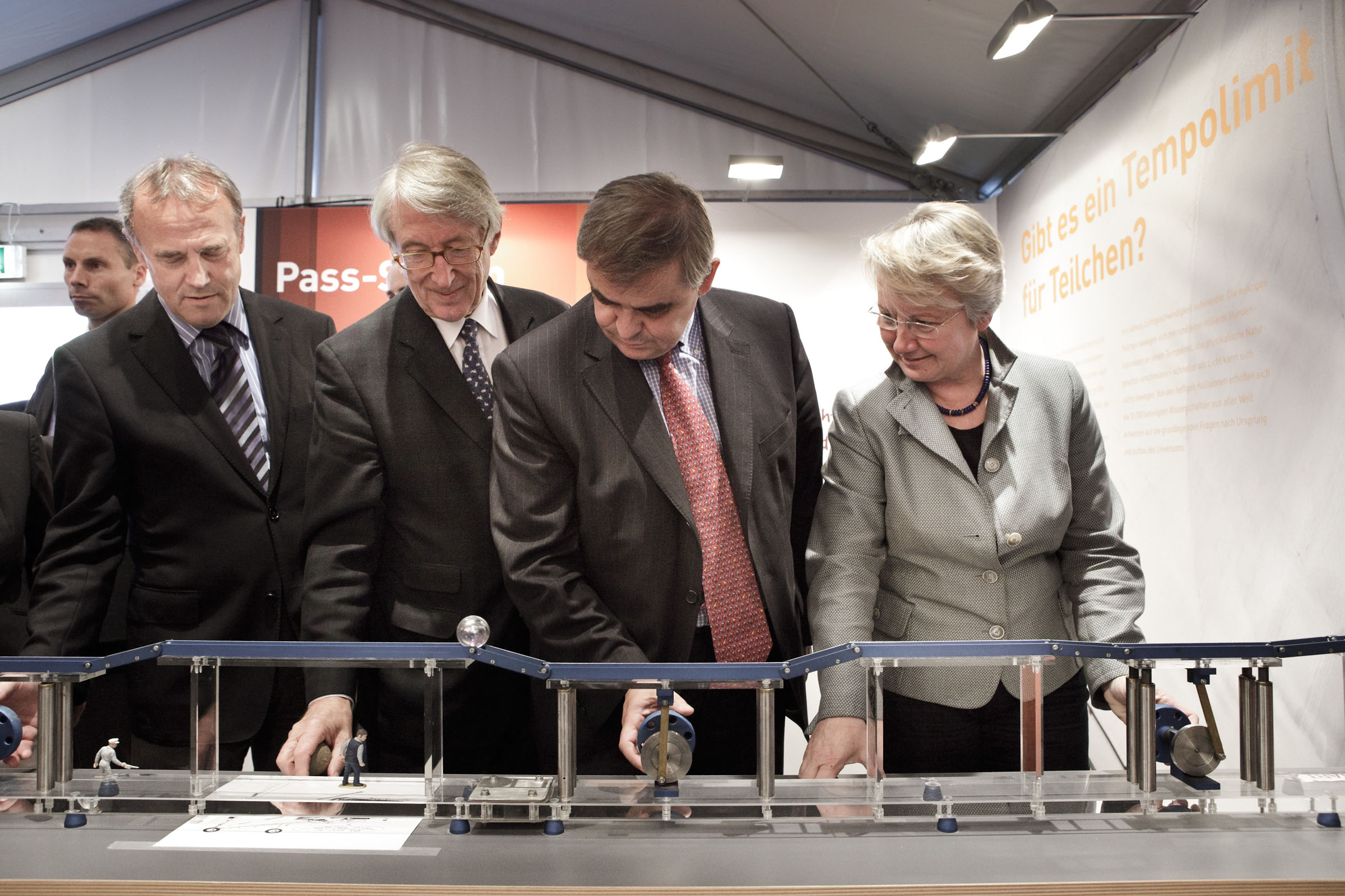 von links nach rechts: Joachim Rippel, Minister für Wirtschaft und Wissenschaft des Saarlandes, Prof. Dr. Dr. Ernst Th. Rietschel, Präsident der Leibniz-Gemeinschaft und stellvertretender Vorsitzender der Gesellschafterversammlung von Wissenschaft im Dialog (WiD), Peter Müller, Ministerpräsident des Saarlandes, Prof. Dr. Annette Schavan, Bundesministerin für Bildung und Forschung © Wissenschaftsjahr 2009 - Forschungsexpedition Deutschland