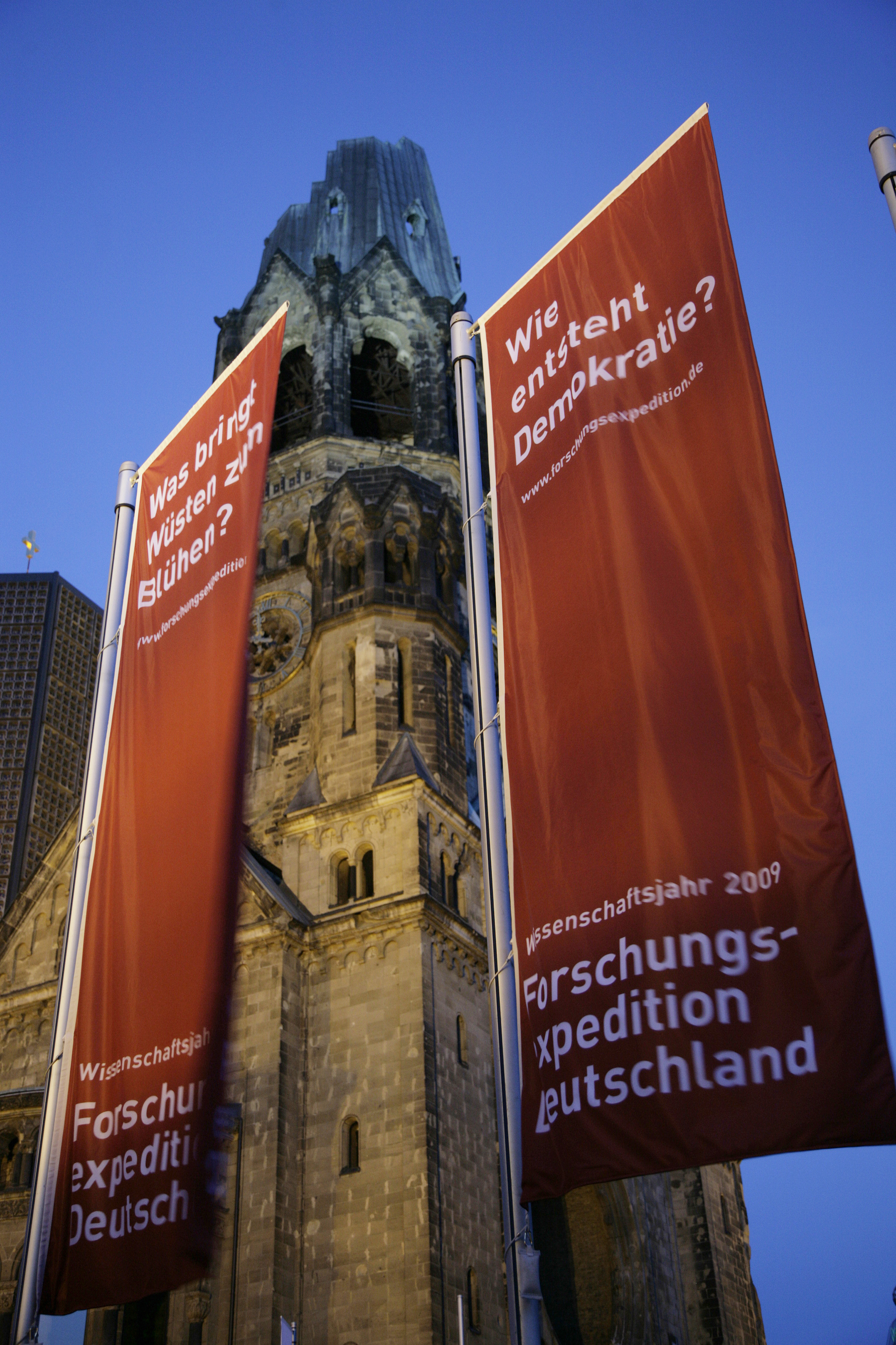 Fahneninstallation "120 Fragen an die Forschung" am Breitscheidplatz, 10789 Berlin © Wissenschaftsjahr 2009 - Forschungsexpedition Deutschland