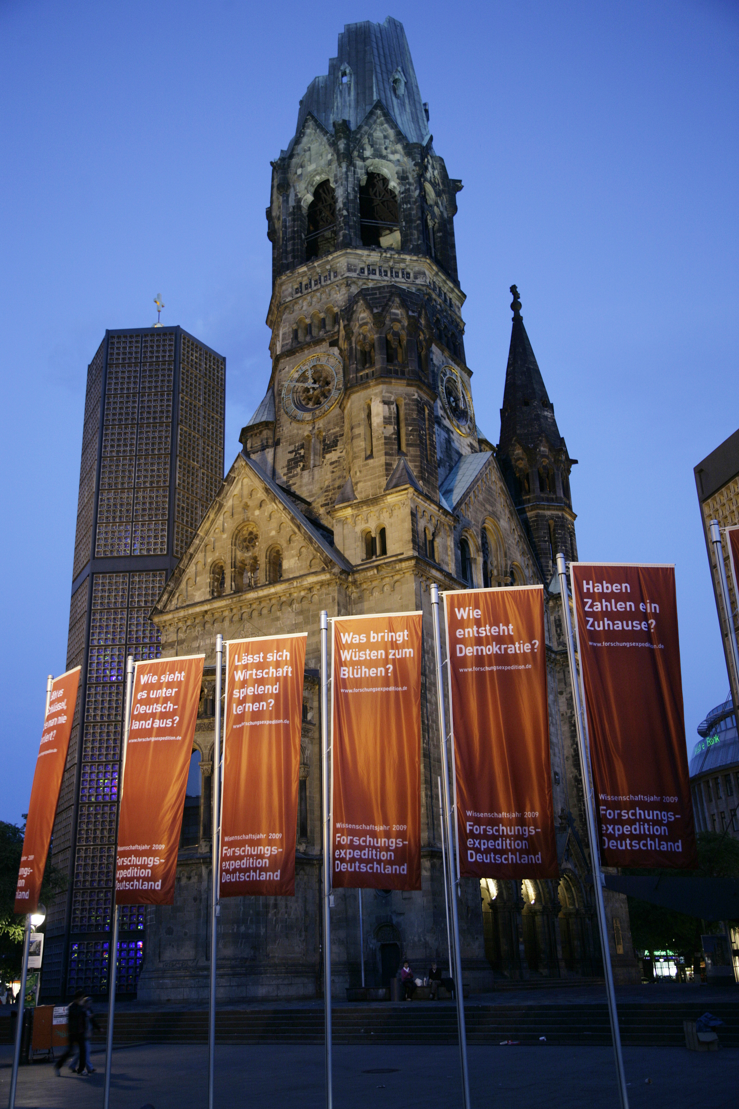 Fahneninstallation "120 Fragen an die Forschung" am Breitscheidplatz, 10789 Berlin © Wissenschaftsjahr 2009 - Forschungsexpedition Deutschland