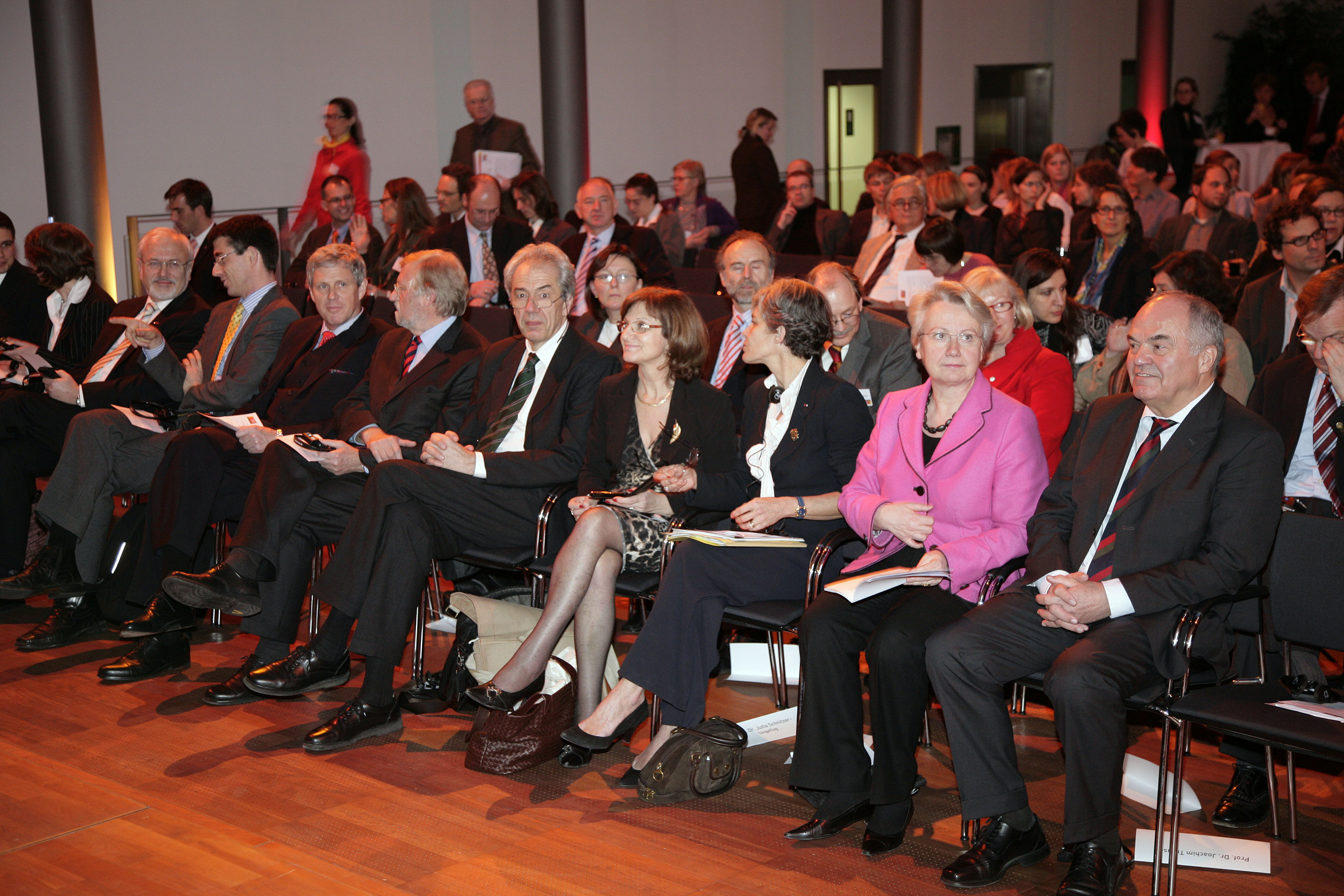 v.l.n.r. Ridha Azaiz, Atje Drexler, Prof. Dr. Eberhard Umbach, Prof. Dr. Tilman Brück, Prof. Dr. Andreas Schlüter, Prof. Dr. Gerold Wefer, Prof. Dr. Ulrich Wengenroth, Begleitung von Mme Claudie Haigneré, Mme Claudie Haigneré, Prof. Dr. Annette Schavan, Prof. Dr. Joachim Treusch © Amin Akthar