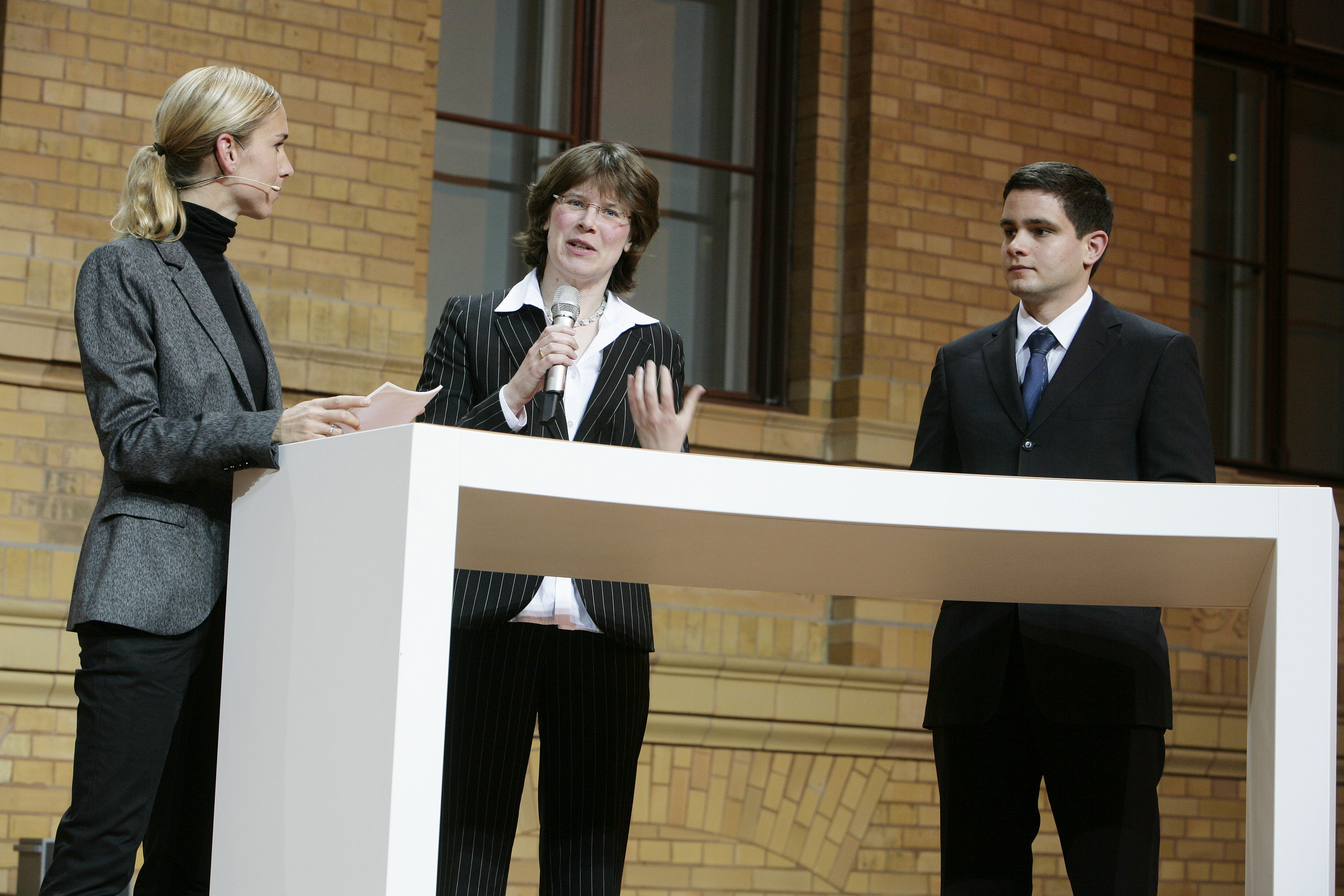 Moderatorin Frau Dr. Ulrike Brandt-Bohne mit Frau Drexler der Robert Bosch Stiftung (Mitte) und Studentblogger Ridha Azaiz © Amin Akthar