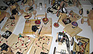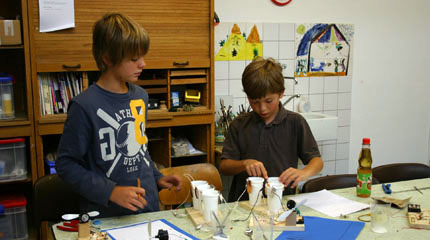 Für die nächste Aufgabe, Autos zu bauen, wurden Federwerk-Motoren und Schwungrad-Motoren zur Verfügung gestellt. Hierbei erfuhren die Kinder wie eine mechanische Speicherung der Energie möglich ist. Beim Schwungradmotor ist die Energie in der Bewegung gespeichert und beim Federwerk-Motor in der Kraft der gespannten Feder. Schnell kam auch die Frage auf, ob nicht auch diese Energie genutzt werden kann, um die Autos mit Licht zu versorgen. Dazu wurde ein Elektromotor über ein Gummiband z.B. vom Schwungradmotor angetrieben. Der Elektromotor wurde nun zum Generator und erzeugt Strom für die Lampen. Bei den nächsten Versuchen wurde beobachtet, dass die Fahrzeuge nun nicht mehr so weit fahren konnten wie ohne Licht; die mechanisch gespeicherte Energie wurde nun auf den Antrieb und die Lichterzeugung aufgeteilt.