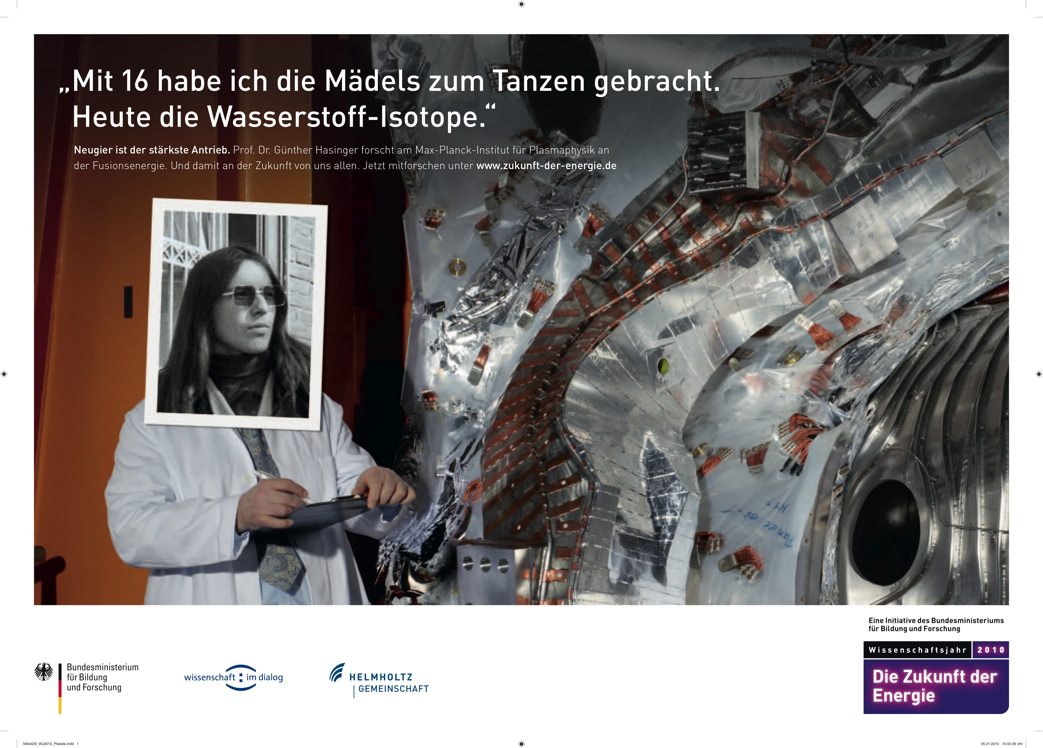 Auf dem Plakat steht der Fusionsforscher Professor Hasinger vor dem im Bau befindlichen Fusionsreaktor Wendelstein 7-X im Max-Planck-Institut für Plasmaphysik in Greifswald.