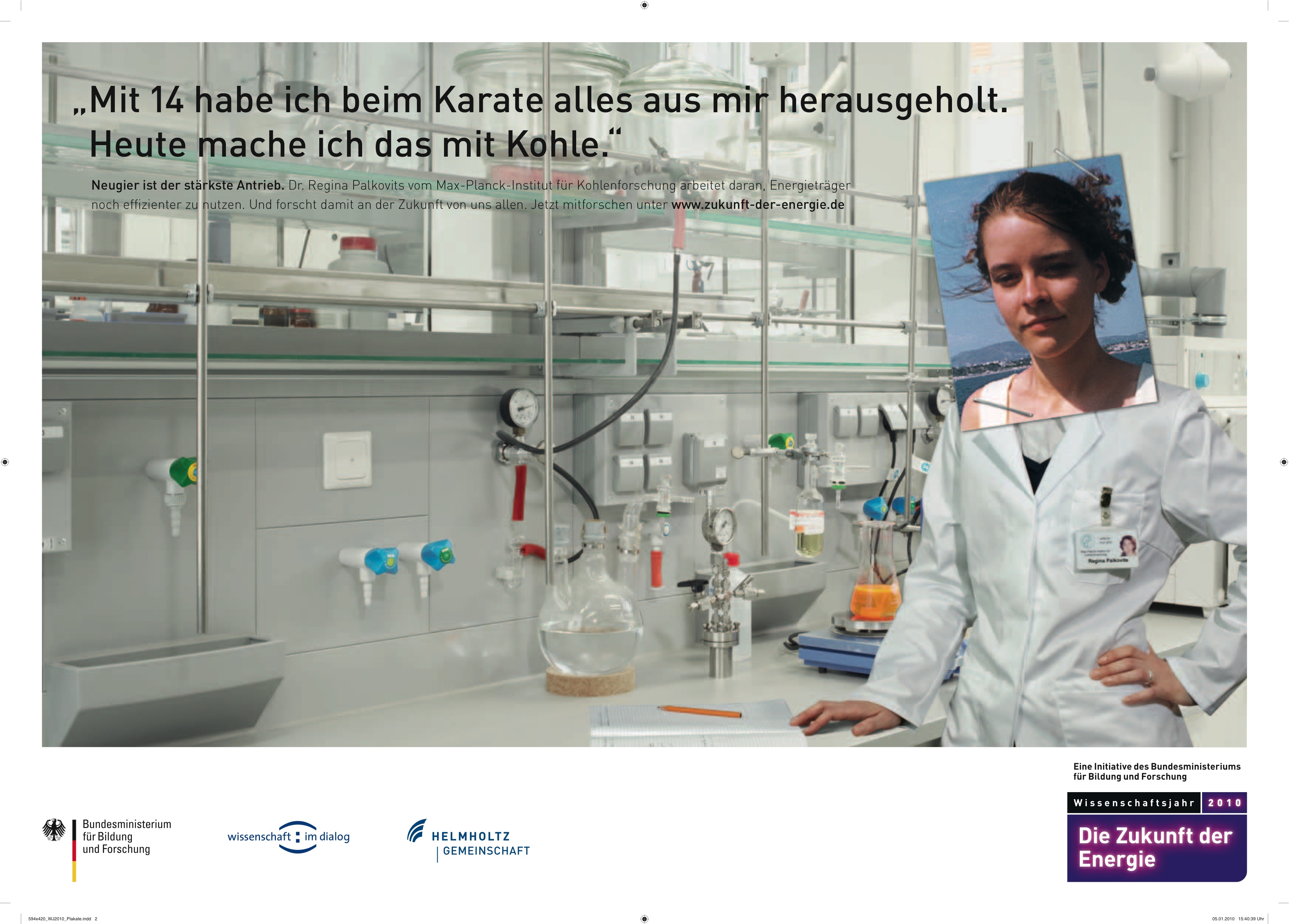 Hier können Sie das Plakat der Themenbotschafterin des Wissenschaftsjahrs 2010 – Die Zukunft der Energie downloaden: Prof. Dr. Griehl ist vor einem Blasen-säulenreaktor zur Kultivierung von Mikroalgenzell-kulturen am Institut für Biowissenschaften der Hochschule Anhalt abgebildet.
