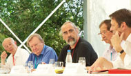 Im Bild v.l.n.r.: Direktor Potsdam-Institut für Klimafolgenforschung Hans Joachim Schellnhuber, Nobel Laureat Carlo Rubbia, wissenschaftlicher Redakteur Geoffrey Carr von "The Economist" (UK), Nobel Laureat Yuan Tseh Lee, Staatssekretär Dr. George Schütte aus dem Bundesministeriums für Bildung und Forschung.