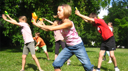 Die Gruppe setzte sich zu Beginn des Workshops anhand von Utensilien wie Batterien, Traubenzucker, Müsliriegeln oder Luftballons mit dem Begriff Energie auseinander, und filterte dabei heraus, dass der Körper ein großes Energieumwandlungskraftwerk ist. Die Teilnehmer zeichneten in einen Körperumriss ein, wo sich ihr Körper warm, heiß oder kühler anfühlt, und stellten dabei fest, wo ein Körper mehr und weniger durchblutet ist. Weiterhin führten wir die „Entspannung“ ein, die wichtig für den Tanz ist. Sie beschäftigten sich mit verschiedenen Bewegungsformen wie Fallen, Heben, Rollen, Drehen und Springen. Wir nahmen außer dem normalen Boden, Therabänder, ein Trampolin und eine Weichbodenmatte, um die verschiedenen Energieeinsätze des Körpers herauszufiltern. Als weiteres Hilfsmittel zur energiegeladenen Bewegungsfindung kamen Wasserpistolen zum Einsatz. Die Teilnehmer fanden selbstständig Bewegungen, die die Kraft des Abspritzens der Wasserpistole fokussierten. Es entstand eine sehr energiegeladene Bewegungsreihenfolge, die für die geplante Parcours-Performance immer wieder geübt wurde. Für die Parcours-Performance zum Abschluss nutzen wir mehrere Stationen rund um und in der Kinder-Akademie Fulda. Beispielsweise den langen Gang zwischen Kinder-Akademie und nahe gelegenem Park, den wir durch unsere Bewegungen räumlich hervorhoben. Die Kinder und Jugendlichen rannten schnell entlang, bewegten sich im Zick-Zack von Wand zu Wand, drehten und kreiselten. Ebenso wurde in die Performance die Bewegung des „Foucaultschen Pendels“ im Foyer aufgenommen. Alle Stationen und Bewegungsreihenfolgen wurden zu einer Parcours-Performance zusammengestellt, die die Zuschauer, die sich selbst bewegten, begleiteten, und die dabei von Station zu Station ihre Perspektive wechselten. Der Energie-Fluss, entstanden durch andauernde Bewegung und Fortbewegung, bildete ein Erlebnis für die Teilnehmer als auch für die Zuschauer.