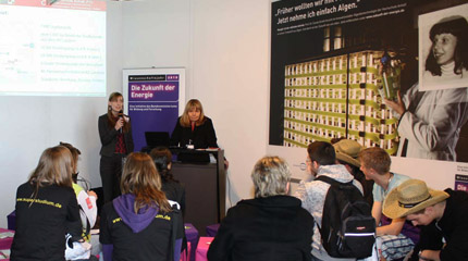 Am Stand des Wissenschaftsjahres Energie auf der TectoYou, die im Rahmen der Hannover Messe statt fand, erlebten sie die Forschungsbörse live. Die Forscherinnen und Forscher, wie z.B. Frau Prof. Carola Griehl von der Hochschule Anhalt, kamen extra nach Hannover gereist, um den jungen Interessierten von ihren Themenschwerpunkten und ihrem Arbeitsumfeld zu berichten. Die Forschungsbörse ist eine Internetplattform des Wissenschaftsjahres Energie, die den Dialog zwischen der Wissenschaft und Schülerinnen und Schülern fördern soll.