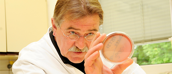 Prof. Dr. Helge Karch (58) ist Mitglied der nationalen Forschungsplattform für Zoonosen und leitet das Institut für Hygiene der Medizinischen Fakultät der Universität Münster. Seit 2005 ist an seinem Institut das Konsiliarlabor des Robert Koch-Instituts für das Hämolytisch-urämische Syndrom (HUS) angesiedelt.
