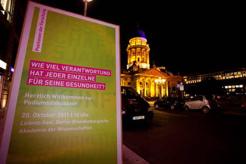 Welche Chancen bietet moderne Gesundheitsforschung, und was bedeutet das für das Leben des Einzelnen? Bei einer Podiumsdiskussion am 20. Oktober in der Berlin-Brandenburgischen Akademie der Wissenschaften gab es dazu unterschiedliche Ansichten aus Wissenschaft, Ethik und Gesellschaft. Die Veranstaltung mit dem Titel „Wie viel Verantwortung hat jeder Einzelne für seine Gesundheit?“ war Auftakt der Diskussionsreihe „Positionen der Forschung“ im Rahmen des Wissenschaftsjahres 2011 – Forschung für unsere Gesundheit.