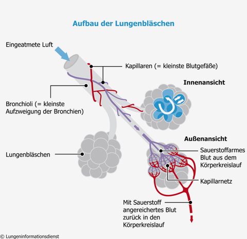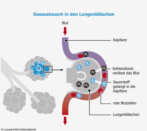 Kohlendioxidreiches, sauerstoffarmes Blut wird vom Herzen Richtung Lunge gepumpt. Ähnlich dem immer feiner werdenden Luftleitsystem der Bronchien verästeln sich auch die Blutgefäße, die zur Lunge führen. Direkt an den Lungenbläschen ist dieses Adernetz (Kapillaren) schließlich sehr fein und lagert sich direkt an die dünnen Wände der Lungenbläschen an. So kann das Kohlendioxid vom Blut in die Lunge diffundieren und gleichzeitig Sauerstoff ins Blut aufgenommen werden. Nach dem Austausch wird das sauerstoffreiche Blut wieder zum Herzen und zu den Organen im restlichen Körper gepumpt. Die von Lungenbläschen und Kapillaren gemeinsam gebildete Fläche wird als respiratorische Oberfläche bezeichnet, sie ist beim Erwachsenen circa 100 bis 140 Quadratmeter groß, dies entspricht etwa der Größe eines Tennisplatzes.
