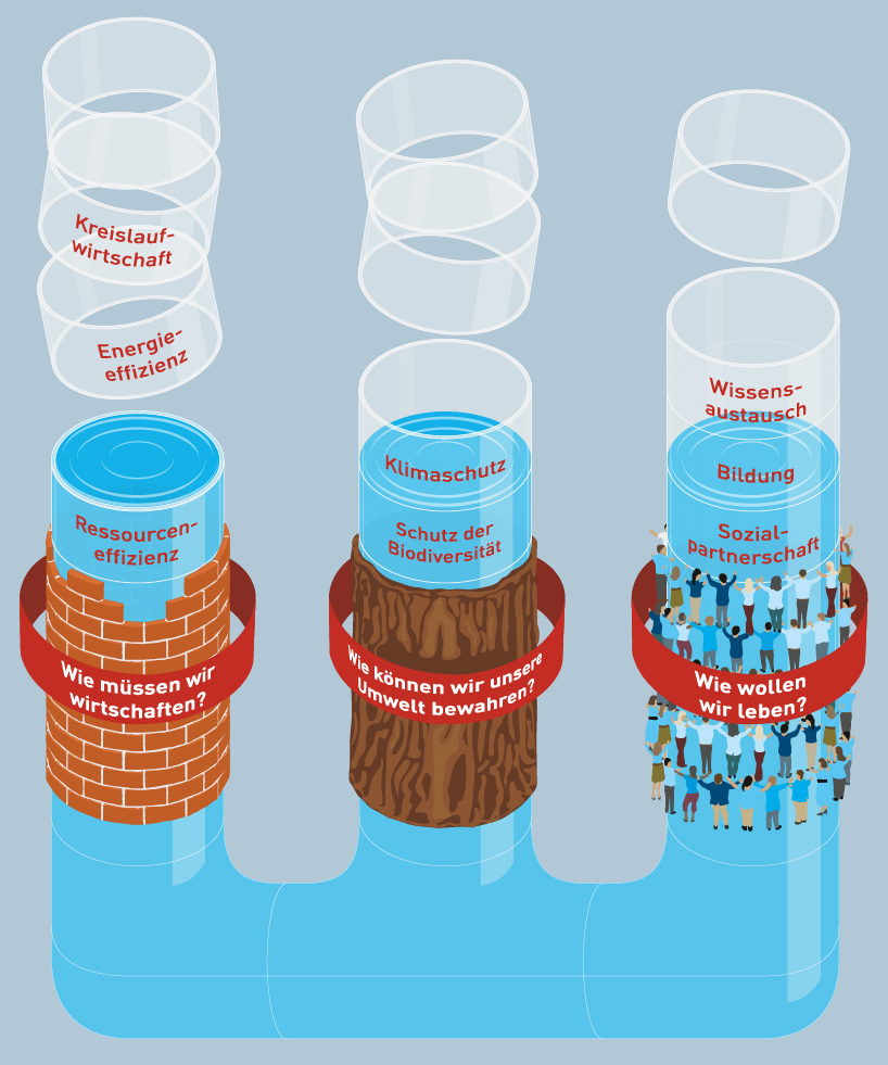 Nachhaltigkeit wird in drei Dimensionen beschrieben, die in einem engen Abhängigkeitsverhältnis zueinander stehen. Das Wissenschaftsjahr Zukunftsprojekt Erde greift diese Dimensionen in Form von drei Fragestellungen auf, die deutlich machen: Auf dem Weg in eine nachhaltige Zukunft gibt es Fragen, die von Gesellschaft, Politik und Wirtschaft gemeinsam beantwortet werden müssen.