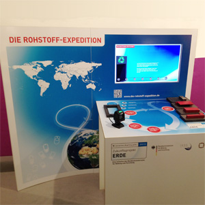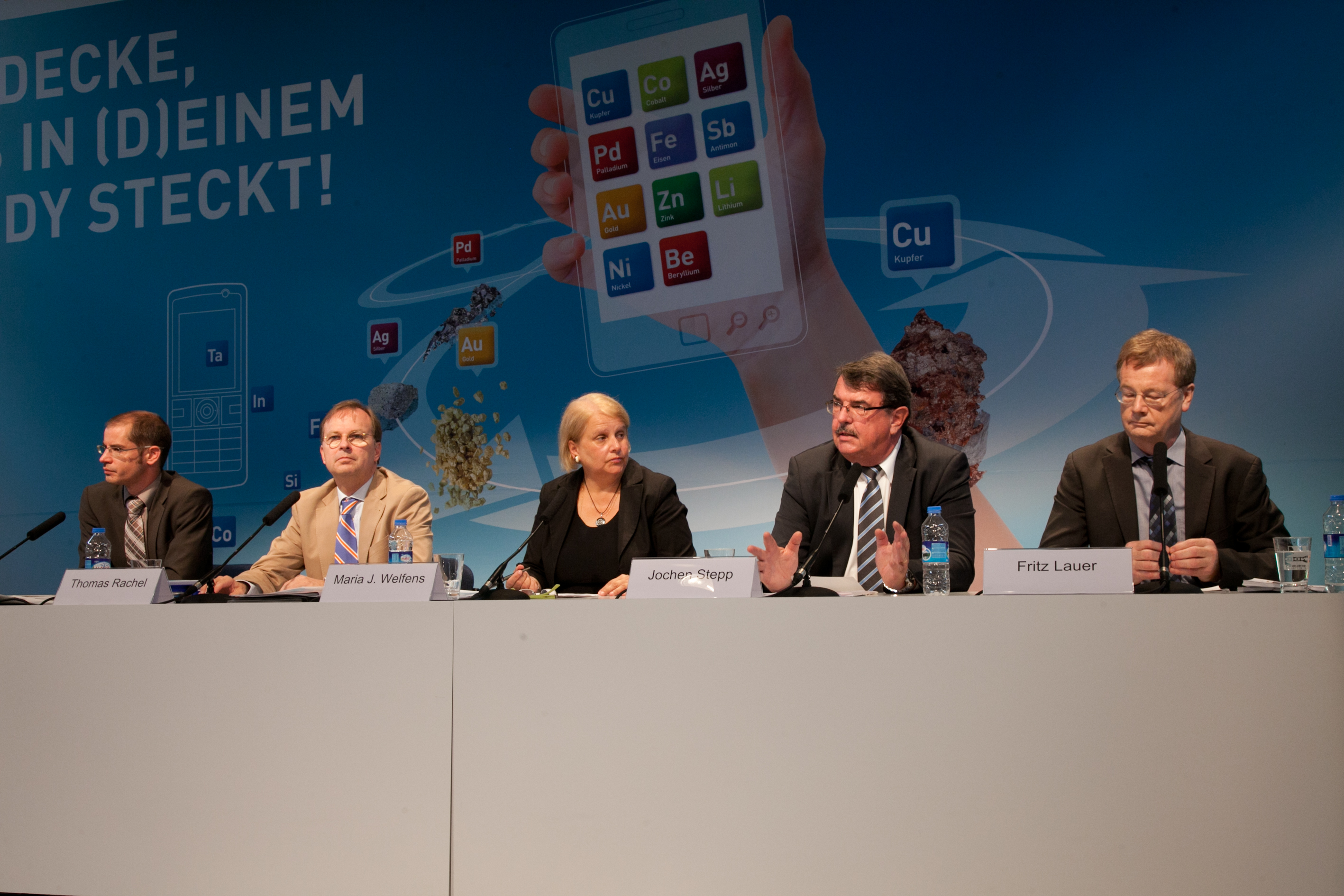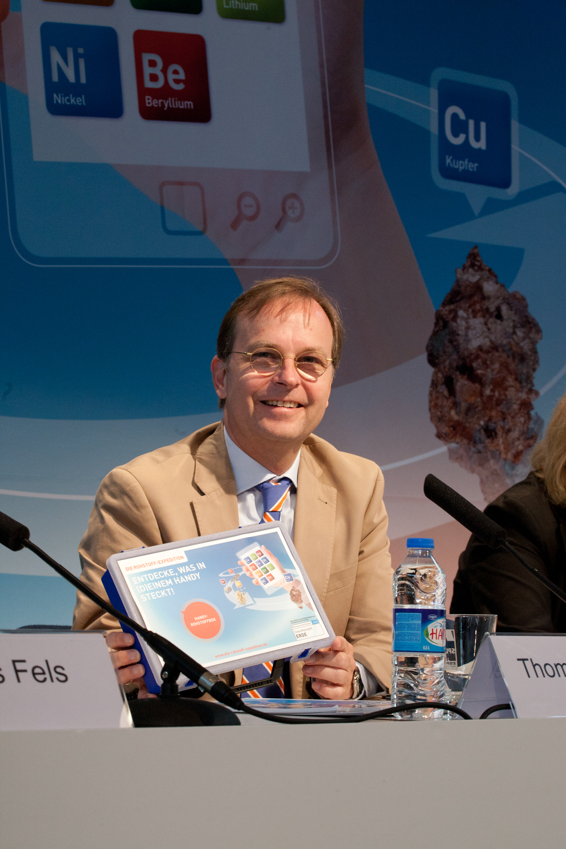 Parl. Staatssekretär Thomas Rachel mit der Rohstoff-Box, in der sich neun Rohstoffe, die in einem Handy verbaut sind, befinden.