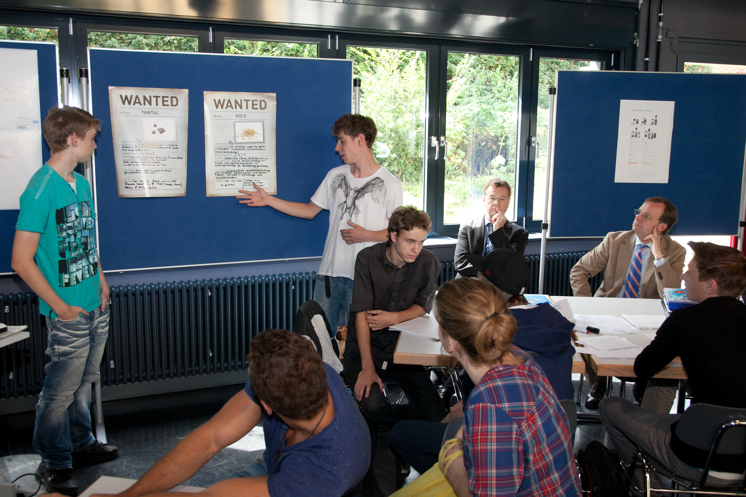 Parl. Staatssekretär Thomas Rachel und Dr. Fritz Lauer im Interview mit Schülerinnen und Schülern im Rahmen der ersten Schulstunde der Rohstoff-Expedition.