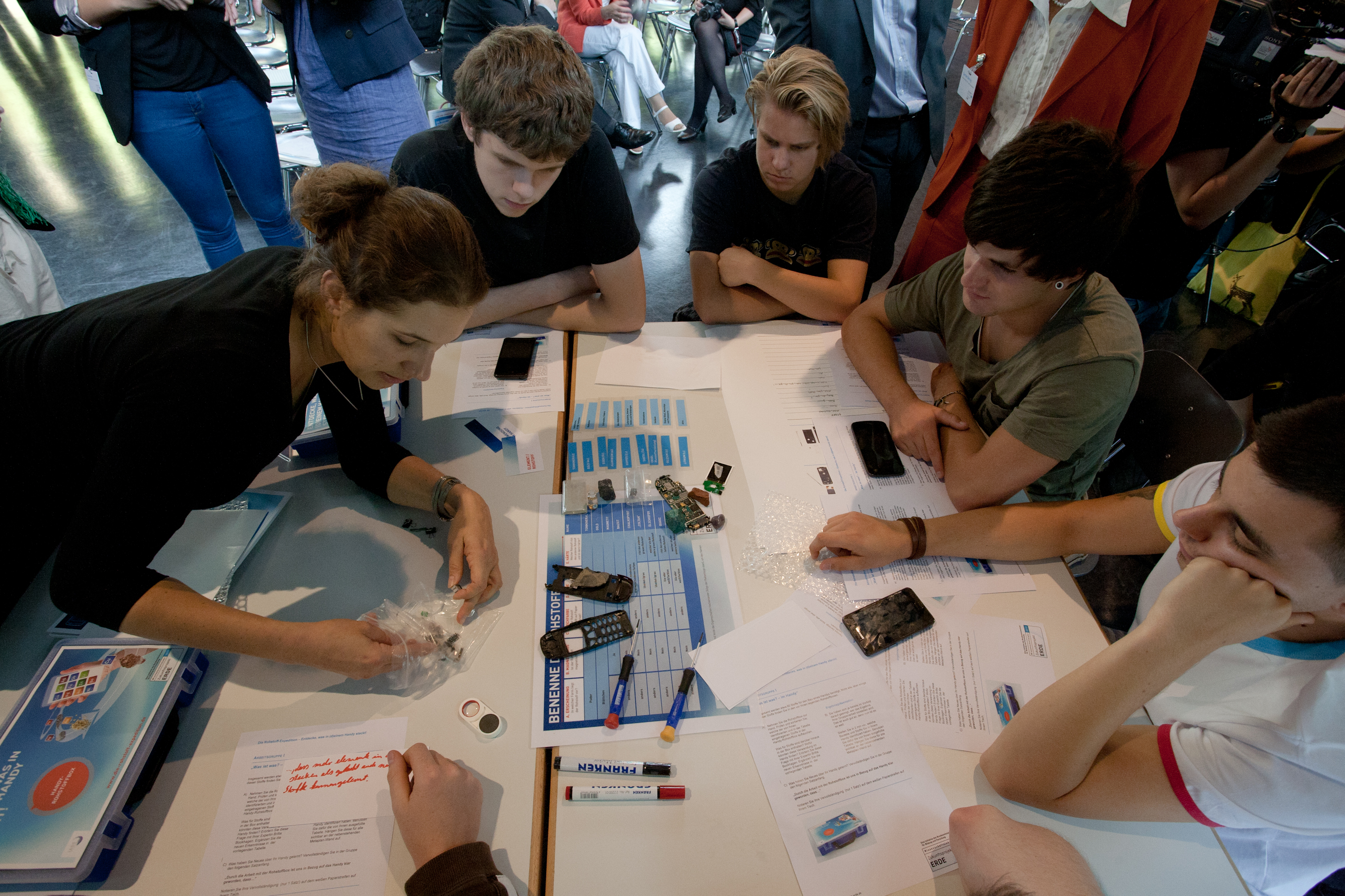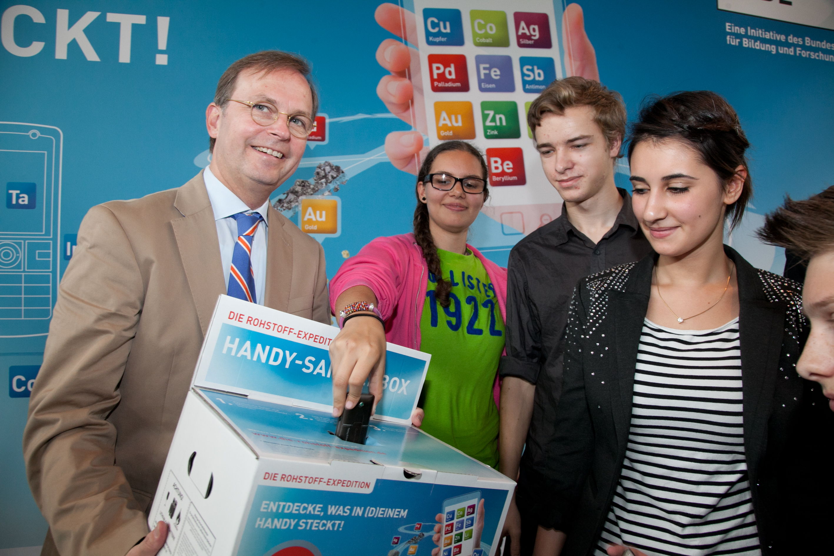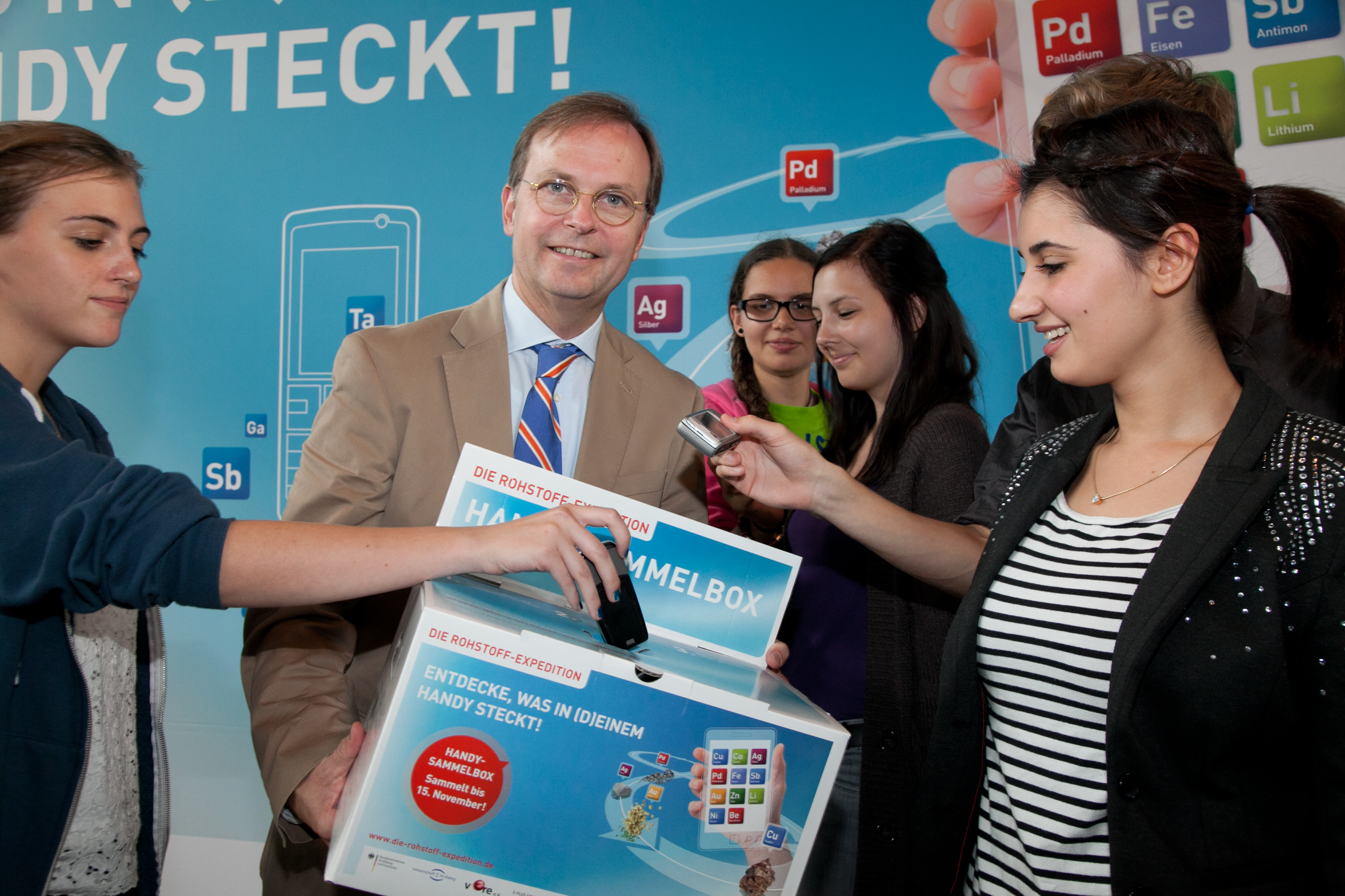 Das erste Handy fällt in die Sammelbox, Parl. Staatssekretär Thomas Rachel mit Schülerinnen und Schülern des OSZ KIM.