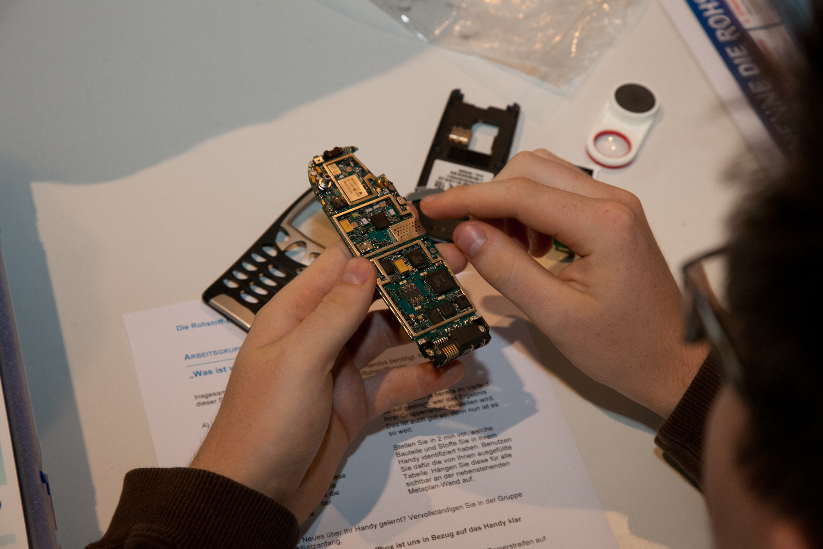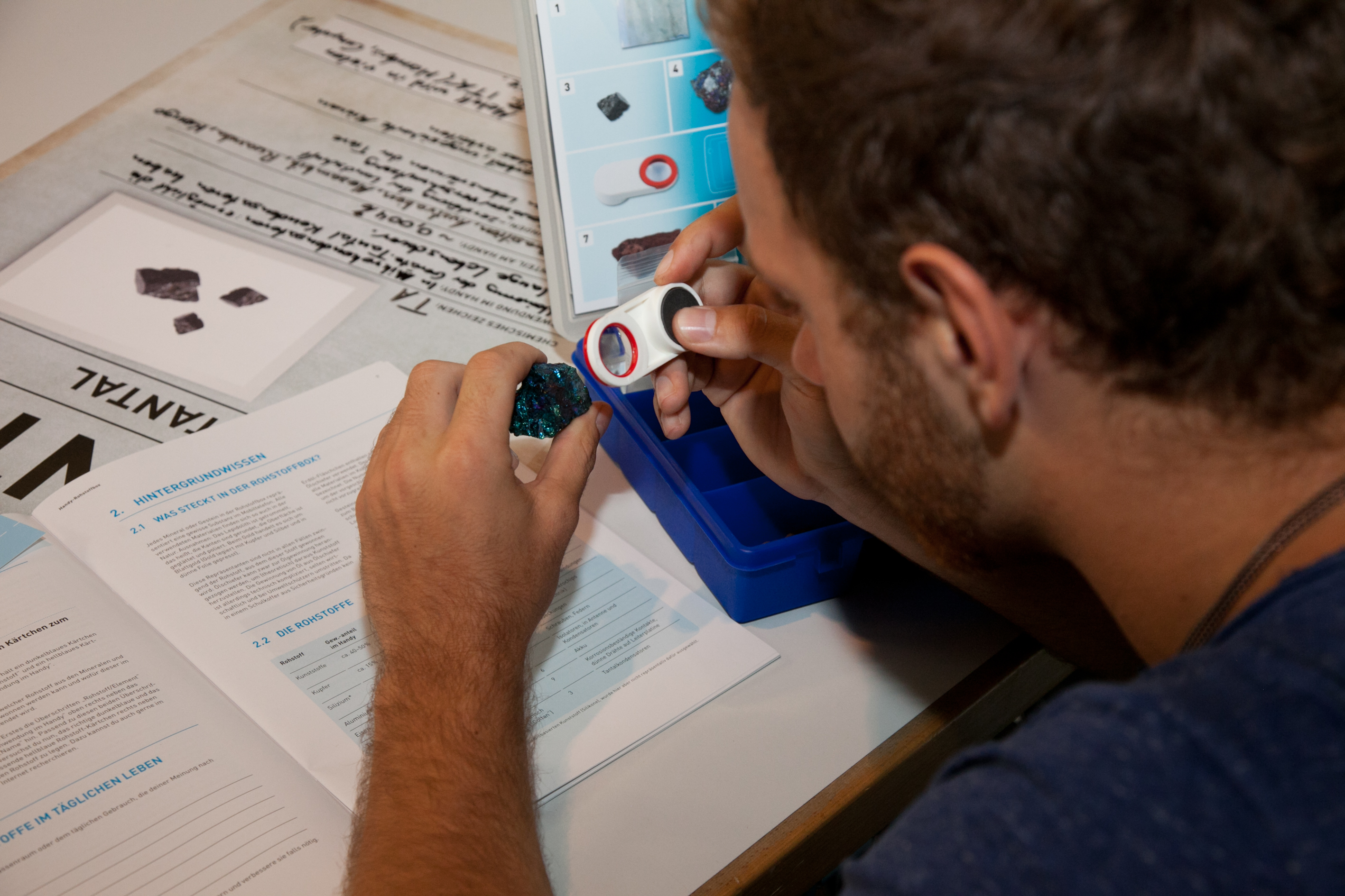 Ein Schüler des OSZ KIM untersucht bei der Schulstunde den Rohstoff Tantal, der sich in der Handy-Rohstoffbox befindet.