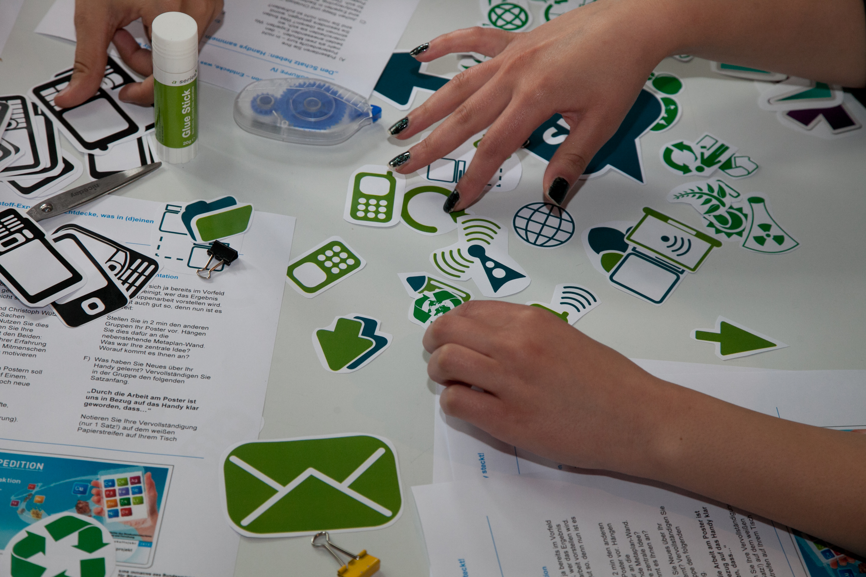Schülerinnen und Schüler des OSZ KIM befassen sich bei der Schulstunde mit dem Lern- und Arbeitsmaterial der Rohstoff-Expedition.