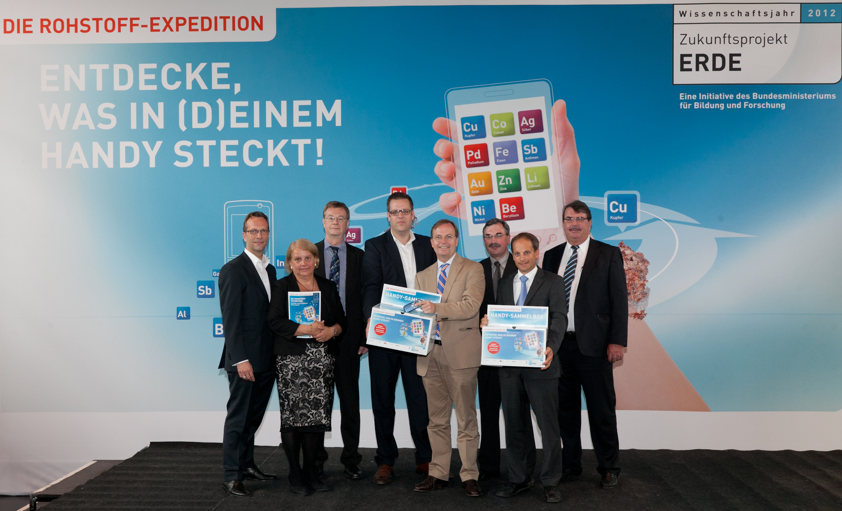 Parl. Staatssekretär Thomas Rachel mit den Partnern der Handy-Aktion (v.l.n.r.): Harald Geywitz (E-Plus Gruppe), Dr. Maria-Jolanta Welfens (WI), Dr. Fritz Lauer (Telekom Deutschland GmbH/Deutsche Telekom Technik GmbH), Dirk Ulrich (TEQPORT Services), Thomas Rachel, Dr. Thomas Michael Schüller (Vodafone D2 GmbH), Marcus Sardison (Telefónica Germany), Jochen Stepp (VERE e.V.).