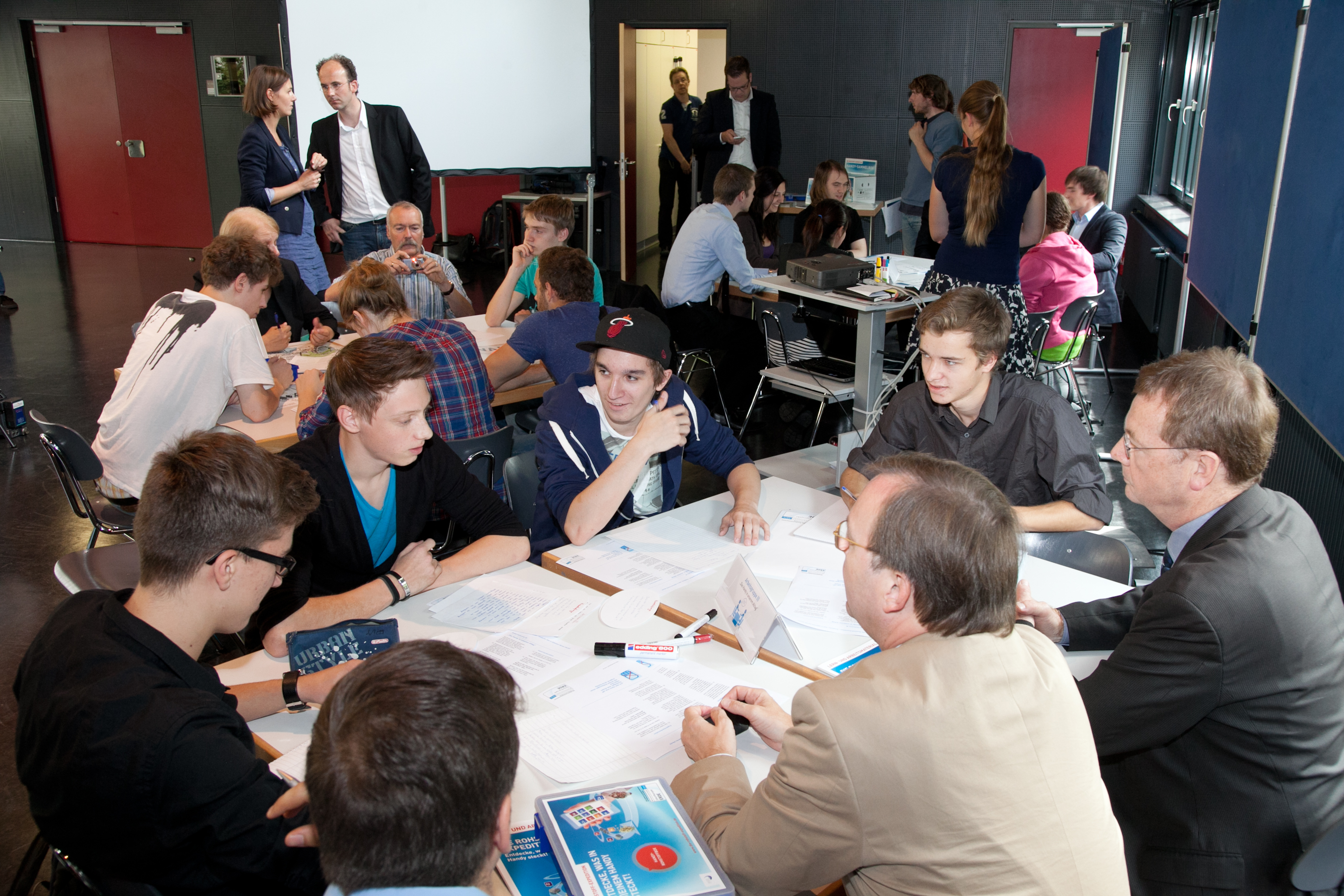 Parl. Staatssekretär Thomas Rachel mit Schülerinnen und Schülern des OSZ KIM.
