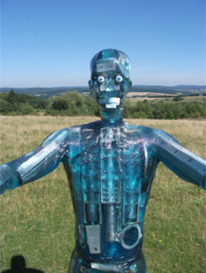 Hier die Kurzbeschreibung des Künstlers: „Anhand einer roboterähnlichen Figur, die aus recyceltem Metall besteht, wird unser technologischer Zeitgeist dargestellt und das Thema Nachhaltigkeit aufgegriffen. Ich schlage vor, dass die Hochtechnologie unserer Zeit, wie z.B. im Bereich der Robotik, ökologisch und soziologisch sinnvoll eingesetzt werden soll und biete als Lösungsvorschlag menschenähnliche Roboter an, die zur Regeneration zerstörter Biotope eingesetzt werden sollen.“