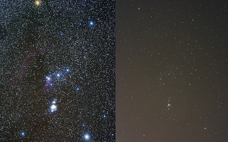 - Das Sternbild "Orion" an einem dunklen (links) und am "lichtverschmutzten" Sternenhimmel über der 500.000-Einwohner-Region Provo-Orem in Utah (USA).