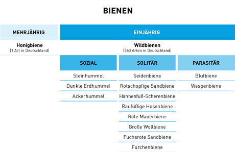 Dabei ist zu beachten, dass die Honigbienen nur als Volk mehrjährig bestehen, die meisten Individuen jedoch, wie bei Wildbienen auch, nur wenige Wochen leben. Die im Schaubild für die jeweiligen Gruppen beispielhaft aufgeführten Arten bzw. Gattungen der Wildbienen werden in Einzelporträts vorgestellt.