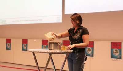 Weitere spannende Slambeiträge zum Thema Nachhaltigkeit beschäftigten sich mit dem Reichweitenmanagement für Elektrofahrzeuge, dem Infochemical Effect, der Substitution von fossilen Energieträgern durch Biomasse. Darüber hinaus erläuterten die Slammer und Slammerinnen dem Publikum, dass man aus Milch die Textilfaser der Zukunft herstellen kann und was sich hinter dem Wind-Hügel-Speed-Up-Effekt verbirgt.
