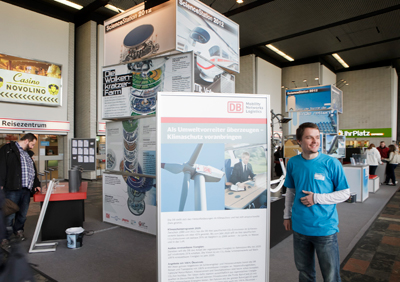 Eilige können sich an einem Infostand mit Lesestoff für die nächste Zugreise versorgen. Schulklassen, Familien und Neugierige mit mehr Zeit dürfen eine Reise in die Zukunft unserer Erde unternehmen und an den Experimentierstationen selbst zum Forscher werden. Wie wird Sonnenlicht in Energie umgewandelt? Wie können wir diese Energie in großem Stil für uns nutzbar machen? Was zeigt eine Wärmebildkamera und zu welchem Zweck wird sie eingesetzt? Und sind Energiesparlampen wirklich energiesparend? Das und mehr können Besucher dank acht interaktiver Exponate herausfinden. Dazu gehört auch der Zug-Fahrsimulator der Deutschen Bahn, an dem die Besucher selbst einmal Lokführer sein und ihre Fahrkünste unter Beweis stellen dürfen. Ziel ist es, durch überlegtes Fahren soviel Energie wie möglich einzusparen – um Kosten zu senken und das Klima zu schützen.