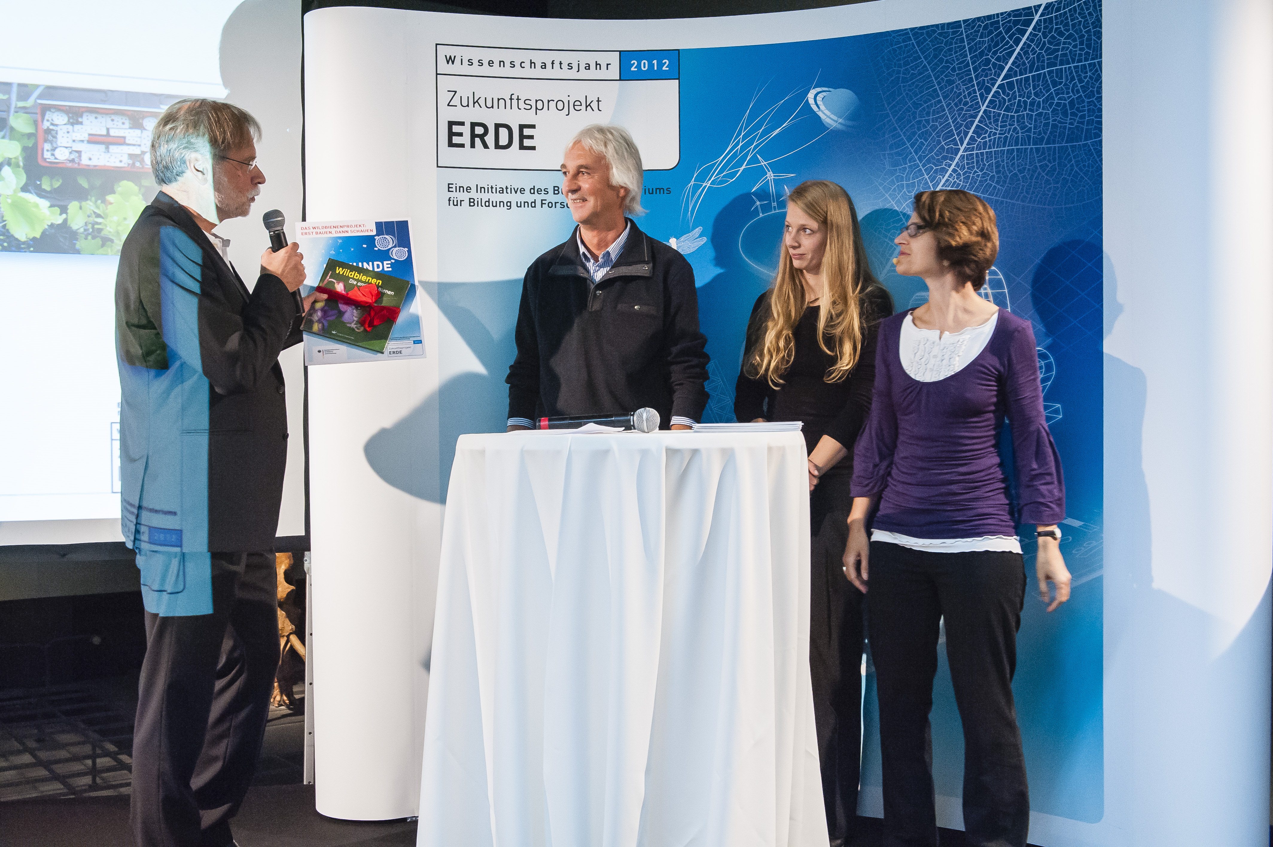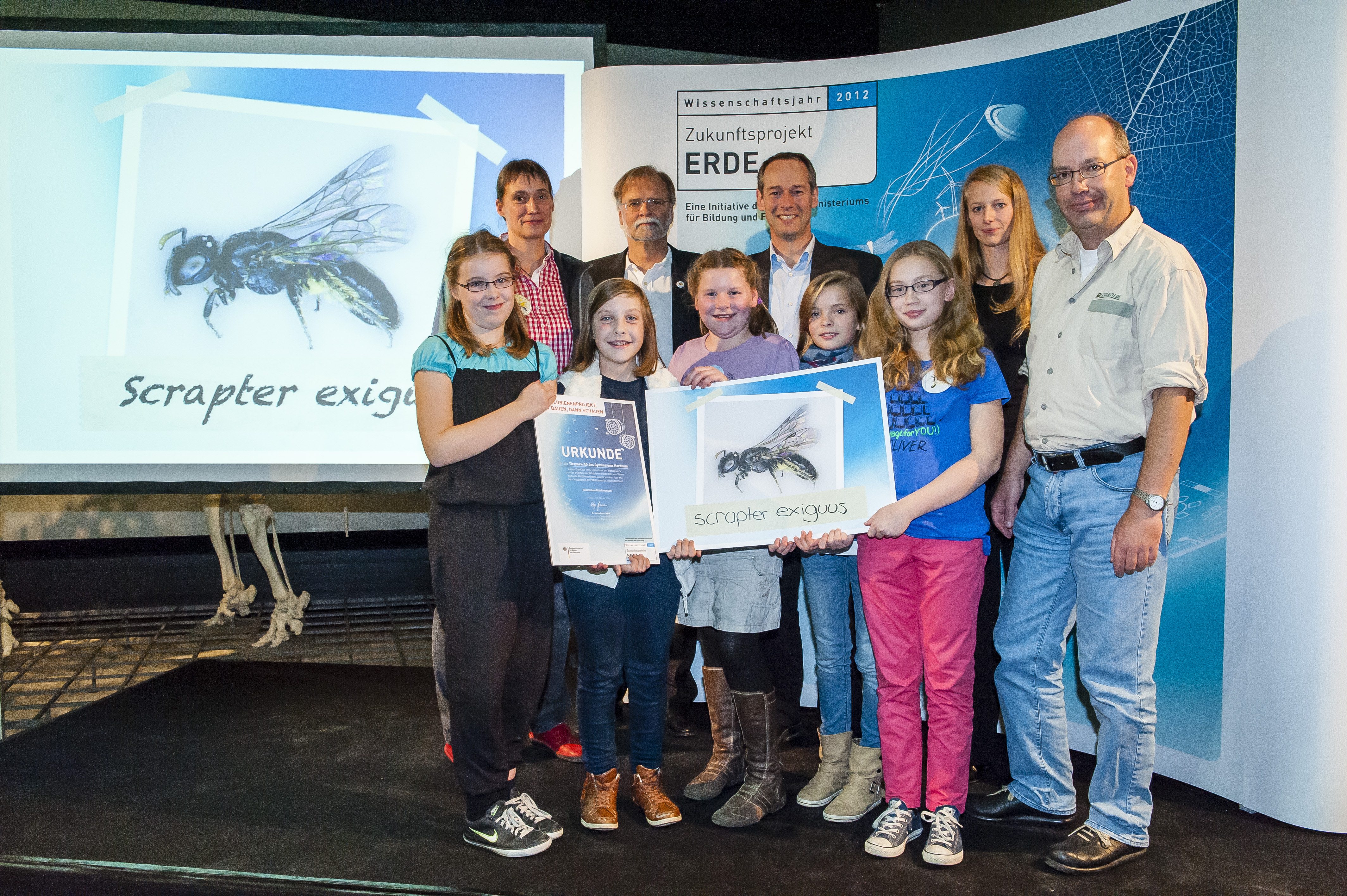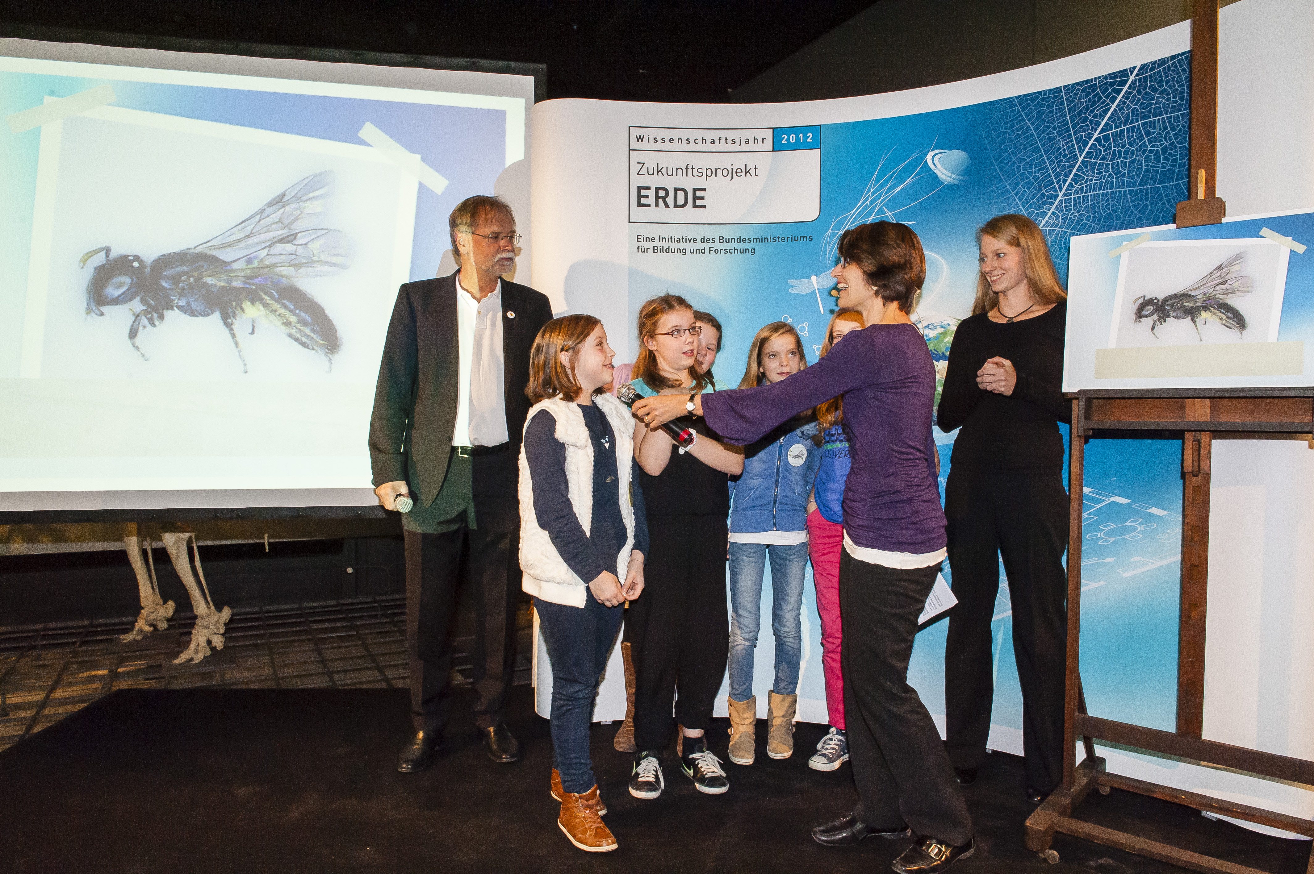 v.l.n.r.: Prof. Dr. Christian Mosbrugger, Direktor der Senckenberg Gesellschaft für Naturforschung, Schülerinnen des Gymnasiums Nordhorn, Christiane Ploetz, Christiane Ploetz, Projektgruppe Wissenschaftsjahr 2012 im BMBF, Jury-Mitglied Kathrin Krausa