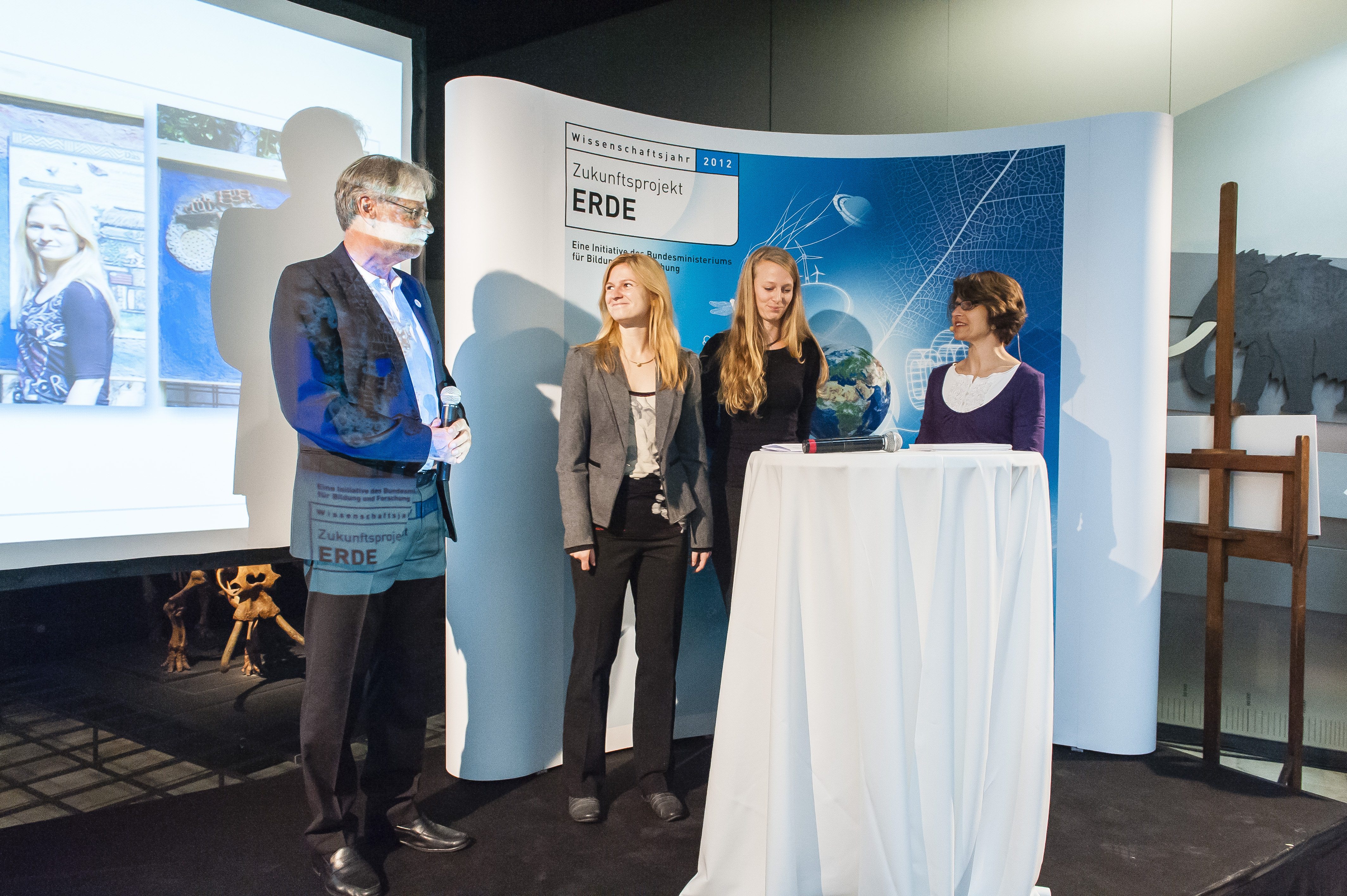 Schülerinnen des Gymnasiums Nordhorn erhalten von Prof. Dr. Christian Mosbrugger, Direktor der Senckenberg Gesellschaft für Naturforschung, eine Teilnahmeurkunde; ganz links: Christiane Ploetz, Projektgruppe Wissenschaftsjahr 2012 im BMBF