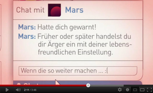 Die Erde spricht mit dem Planeten Mars. Die Erde sagt: „Der Mensch nervt mich!“ Mars antwortet: „Ich hatte dich gewarnt! Früher oder später bekommst Du Ärger mit deiner lebensfreundlichen Einstellung.“