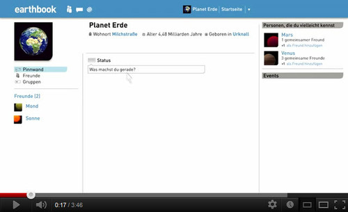 Wir landen auf der Startseite der Erde mit dem Profilbild des schönen, blauen Planeten. Die Erde wohnt in der Milchstraße, ist schon 4,48 Milliarden Jahre alt und wurde im Urknall geboren. Sie ist bereits mit Mond und Sonne befreundet. Mars und Venus werden bestimmt auch bald Freunde sein.