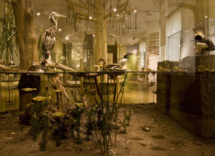 Doch inwiefern wird sich mit der Gesellschaft auch die Natur um uns herum verändern? Wir leben in einer Kulturlandschaft, die maßgeblich vom Menschen geprägt ist und die sich durch andere Lebensweisen auch nachhaltig wandeln kann. Ein anschauliches Beispiel dafür bietet die Oberlausitzer Heide- und Teichlandschaft im Osten Sachsens, die im 13. Jahrhundert unter dem Einfluss zugezogener Mönche entstanden ist. Die Forscher des Senckenberg Museums für Naturkunde Görlitz sind Experten für diese artenreiche Kulturlandschaft und Besucher können sich im Museum ein Bild davon machen. Naturnah gestaltete Dioramen zeigen Tiere und Pflanzen in ihrem typischen Lebensraum – Karpfen, Hecht und Schleie besiedeln den Teich, Rohrdommel, Rothalstaucher und Teichrohrsänger rufen aus dem Schilfröhricht und zwischen Teichboden und Schilf kann man kleine Zwergmäuse oder Laubfrösche entdecken. Einen Eindruck vom Verhalten der Tiere gewinnt man im Vivarium, wo im 8.000 Liter fassenden Teichfischbecken lebendige Karpfen und Schleien ihre Runden drehen.