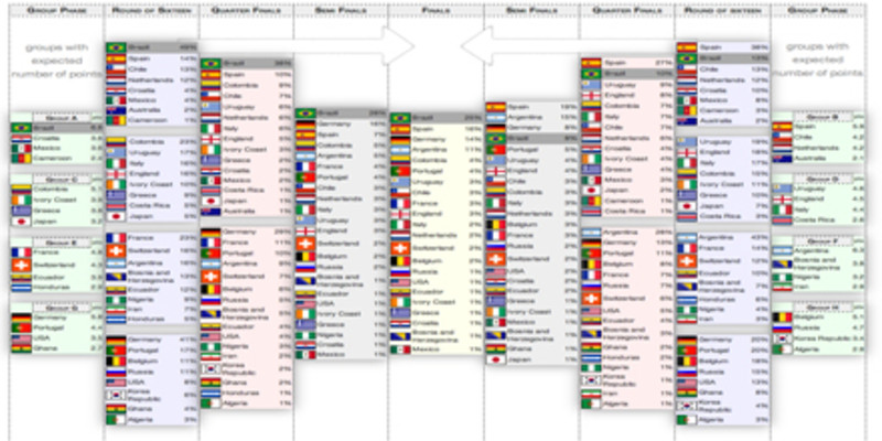 Um den Weltmeister zu ermitteln, werden alle Spiele in einem ganzen Turnier virtuell durchgespielt. Da aber eine einzige Simulation nicht aussagekräftig genug ist (schließlich spielen im Fußball der Zufall und die Tagesform der Spieler eine wichtige Rolle) wird die Simulation bis zu 10.000 Mal ausgeführt - also die gesamte WM wird 10.000 Mal virtuell komplett ausgetragen. Mit diesem System kann der Fortschritt eines jeden Teams bis zum Finale verfolgt werden. Am Ende berechnet das System die relative Häufigkeit, mit der ein Team wie Brasilien oder Spanien ins Viertel-, Halb- oder sogar ins Finale einzieht. Mit dem Simulator wird also letztlich die Wahrscheinlichkeit für den Sieg einer bestimmten Mannschaft errechnet.