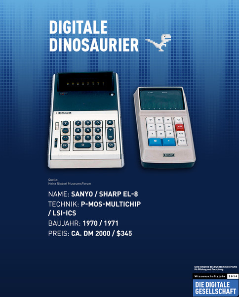 "Die ersten elektronischen Rechner im "Taschenformat" mit Batteriebetrieb - also die ersten Taschenrechner - wurden 1970 beinahe zeitgleich von den japanischen Firmen Sanyo, Sharp und Canon herausgebracht. Das "Herz" dieser ersten Taschenrechner - der Mikrochip - stammte allerdings von US-Firmen wie Texas Instruments und Rockwell.