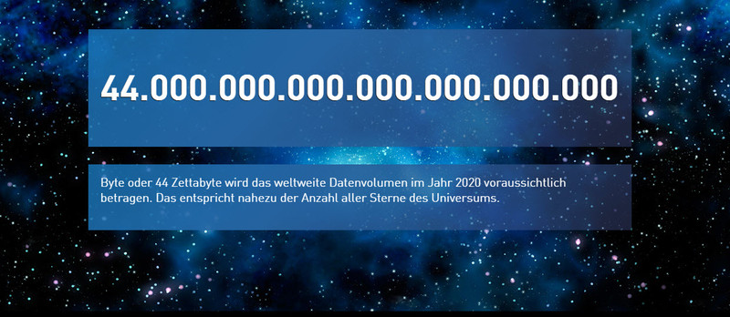 Byte oder 44 Zettabyte wird das weltweite Datenvolumen im Jahr 2020 voraussichtlich betragen. Das entspricht nahezu der Anzahl aller Sterne des Universums.
