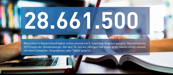Menschen in Deutschland haben schon einmal ein E-Learning-Angebot genutzt. Das entspricht 35 Prozent der Bundesbürger. Bei den 14- bis 44-Jährigen hat sogar jeder zweite schon einmal mit dem Computer, Smartphone oder Tablet gelernt.