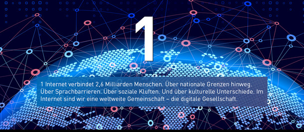 1 Internet verbindet 2,6 Milliarden Menschen. Über nationale Grenzen hinweg. Über Sprachbarrieren. Über soziale Kluften. Und über kulturelle Unterschiede. Im Internet sind wir eine weltweite Gemeinschaft – die digitale Gesellschaft."