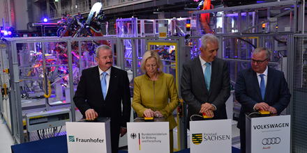 Die "E3-Produktion" am Fraunhofer IWU in Chemitz arbeitet mit einer exakten Kopie einer Prozesskette für den Zusammenbau einer Autotür. Hier wird der Einsatz von Industrierobotern im Arbeitsbereich des Menschen untersucht, wobei Monteure weiterhin die Feinarbeit leisten. E3-Lösungvorschläge werden praxisnah entwickelt und haben den Anspruch, Schlüsselbranchen für innovative Themen und Ergebnisse zu sensibilisieren. Dr. Hubert Waltl, Vorstand Produktion der AUDI AG, sprach bei der Eröffnung davon, dass die digital vernetzte Fabrik noch Vision sei: "Mit der E3-Forschungsfabrik wollen wir diese schrittweise Realität werden lassen".