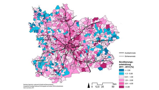 Die Metropolregion München wächst, denn die Einwohnerzahlen steigen. Die Region zählt seit 2011 rund 130.000 Einwohner mehr, in München selbst zogen 43.000 zu. Doch nicht alle Städte und Gemeinden in der Region wachsen. Jede fünfte Kommune schrumpfte zwischen 2011 und 2013. Wissenschaftler der Technischen Universität München (TUM) untersuchen nun flächendeckend die Entwicklung der Faktoren Wohnen, Arbeiten und Mobilität in dem Ballungsraum.