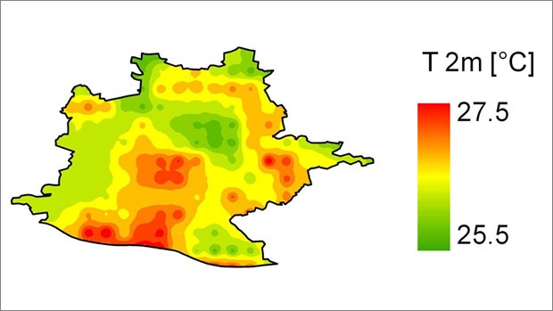 Aufgrund ihrer Kessellage sei die Stadt Stuttgart prädestiniert, um die Temperaturentwicklung und den Transport von Schadstoffen gemeinsam zu betrachten, erklärt Joachim Fallmann vom Institut für Meteorologie und Klimaforschung (IMK-IFU) am KIT. Am Beispiel der Hitzewelle von 2003 wurde das Stadtklima von Stuttgart unter verschiedenen Bedingungen simuliert. So kamen „weiße Häuser", die traditionelle Strategie gegen städtische Aufheizung im Mittelmeerraum, zum Einsatz. „Je heller die Gebäude und Oberflächen in einer Stadt sind, desto geringer ist die Aufheizung, weil kurzwellige Strahlung reflektiert wird", verdeutlicht Fallmann. „Dann sprechen wir von einer hohen Albedo."