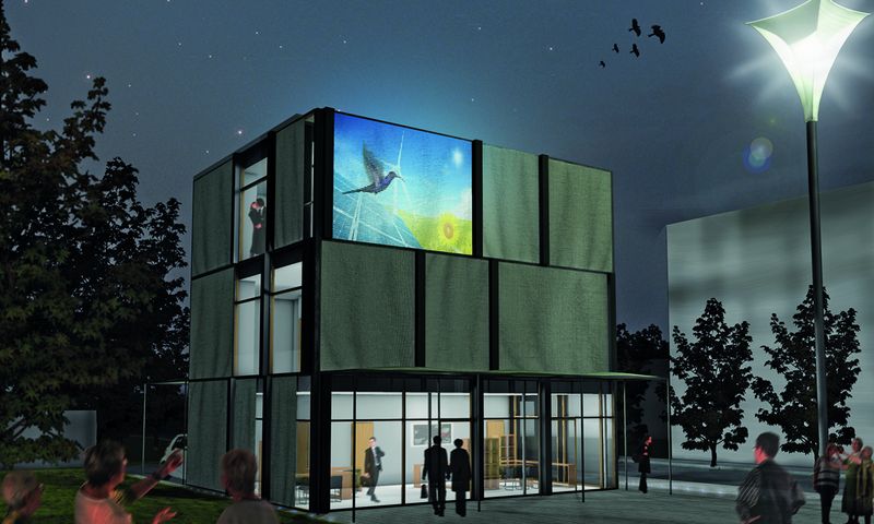 Visioneum Energie+ wird mit einer speziellen Isolierverglasung mit besten Wärmedämmwerten ausgestattet sein. An die Fassade wird ein textiler Sonnenschutz angebracht, der bei Dunkelheit mit Hilfe von LED-Technik als Leuchttafel dienen kann, die Informationen vermittelt. Zugleich lässt sich das aus mehreren Modulen bestehende Haus leicht umbauen und so verschiedenen Lebensphasen anpassen.