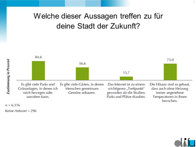 Mit Blick auf das Thema öffentlicher Grünflächen und Parks betonten über 80 Prozent der Befragten den aus ihrer Sicht hohen Rang öffentlicher Grünflächen und Parks für die Stadt der Zukunft. Mehr als die Hälfte derer, die sich an der Umfrage beteiligten, erwartet mehr Gärten für die Nahrungsmittelproduktion, was die Diskussion über Urban Gardening widerspiegelt.