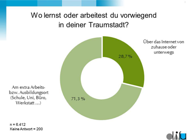 Der gewünschte Arbeitsort war ein weiterer Schwerpunkt: Auch wenn das Internet und die technische Entwicklung es zunehmend ermöglichen, im Homeoffice zu arbeiten, so äußerten doch über 70 Prozent der Antwortenden den Wunsch nach einem von zuhause räumlich getrennten Arbeitsplatz.