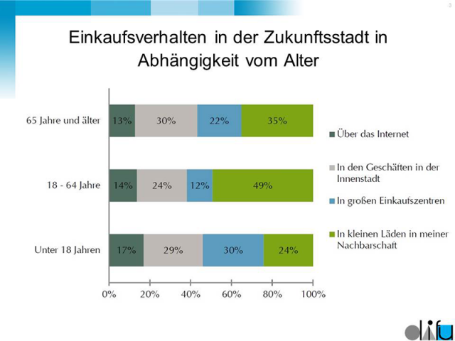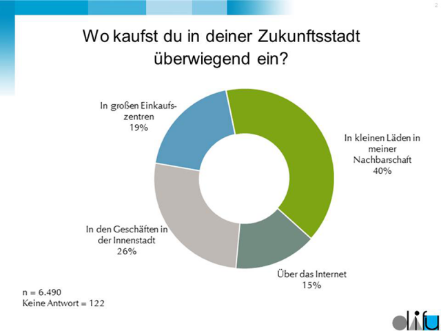 Zum Thema Einkaufen gaben 40 Prozent der Antwortenden an, vorrangig in kleinen Läden der direkten Nachbarschaft einkaufen zu wollen – etwa jeder siebte überwiegend online. Dies zeigt eine Diskrepanz zwischen den Angaben der Befragten und dem momentan zu beobachtenden Trend wachsender Verkaufszahlen u. a. im Online-Handel. Diese Diskrepanz zwischen Zukunftswunsch und heutigem Trend ist bei den Erwachsenen deutlich ausgeprägt. Kinder und Jugendliche dagegen wollen laut Umfrage in ihrer Zukunftsstadt mehrheitlich in Einkaufszentren oder den Geschäften der Innenstadt einkaufen.