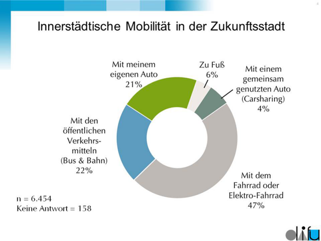 Mit Blick auf das Thema Mobilität schlägt aus Sicht der Antwortenden das Fahrrad im Stadtverkehr alle anderen Fortbewegungsmittel: Mit 47 Prozent möchte nahezu die Hälfte aller Befragten künftig am liebsten mit dem Fahrrad oder Elektro-Fahrrad unterwegs sein. Das eigene Auto und die öffentlichen Verkehrsmittel sind als Fortbewegungsmittel mit je gut einem Fünftel etwa gleich beliebt: 22 Prozent wählten Bus und Bahn, 21 Prozent den eigenen Pkw. 79 Prozent der Antwortenden würden also auf innerstädtischen Strecken künftig den sogenannten Umweltverbund – also zu Fuß, per Rad, ÖPNV und Carsharing – präferieren.