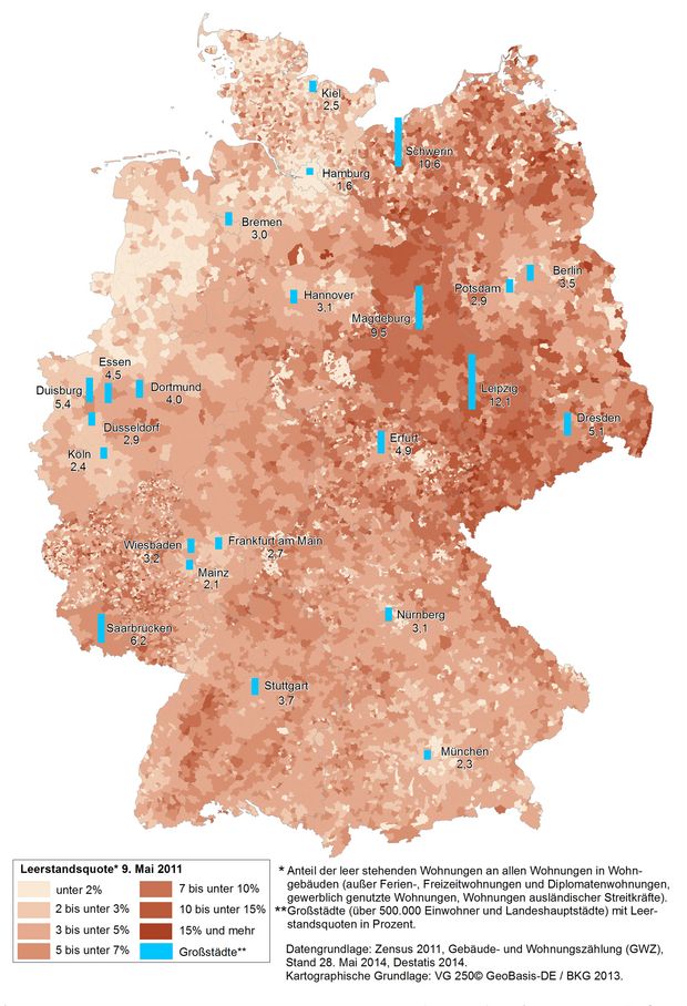 Die Forscher des UFZ haben eine Systematik entwickelt, die Leerstand quantitativ und qualitativ sowie unter Berücksichtigung der verschiedenen Perspektiven bewertet. Sie schlagen eine Kategorisierung in sieben Klassen vor. Diese reichen von „sehr niedrig“ (unter zwei Prozent) bis „extrem“ (über 15 Prozent). Als „angemessen“ wird ein Leerstand in der Spanne von drei bis fünf Prozent betrachtet. „Beispielsweise muss berücksichtigt werden, ob es sich um Mietwohnungs- oder Eigentumsmärkte, ländliche, großstädtische oder metropolitane Märkte beziehungsweise schrumpfende oder wachsende Märkte handelt“, betont Rink. Angewendet haben die Wissenschaftler ihre Methode auf die Daten der bislang einzigen flächendeckenden Gebäude- und Wohnungszählung von 2011, die im letzten Jahr publiziert wurden.