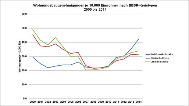 Die BBSR-Experten untersuchten die Entwicklung der Baugenehmigungen in den 107 kreisfreien Städten in Deutschland. Einer kleinen Anzahl von Städten mit schrumpfender Nachfrage stehen mehr und mehr Städte mit stabiler oder wachsender Nachfrage gegenüber. Einen besonders starken Anstieg registrierte das BBSR in den sieben größten deutschen Städten Berlin, Hamburg, München, Köln, Frankfurt, Stuttgart und Düsseldorf. Dort stieg die Zahl der genehmigten Wohnungsbauten gegenüber dem Vorjahreswert noch einmal um fast ein Viertel auf 52.500 Wohnungen. Dieser seit 2009 anhaltende Trend wird auch hier im Wesentlichen durch den Boom im Geschosswohnungsbau getragen.
