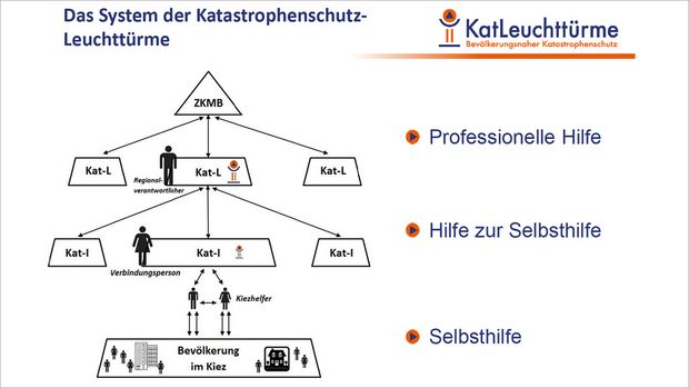 Ein Projektergebnis zeigt, dass dieser Wille zur Selbst- und Nachbarschaftshilfe durchaus auch in großstädtischen Bereichen vorhanden ist. Für ein durchgängiges Informationssystem beim Stromausfall wurde ein zweistufiges System von Anlaufstellen entwickelt (siehe Abbildung): Auf der Kiezebene gibt es flächendeckend verteilte Katastrophenschutz-Informations- und Interaktionspunkte ohne Stromversorgung (Kat-I). Sie sollen möglichst in unmittelbarer Nähe der Wohnungen gut zu Fuß erreicht werden können und der Bevölkerung eine Chance geben, sich in der Notlage auszutauschen und gegenseitig Hilfe zu leisten. Dazu sollen bereits vorhandene Einrichtungen, die aus dem Wohnumfeld bekannt sind wie Kieztreffs bzw. Gemeindezentren als Kommunikationsstrukturen genutzt werden. Zur Unterstützung dieser Entwicklung kommt vom übergeordneten Katastrophenschutz-Leuchtturm ein Mitarbeiter, der Regionalverantwortliche, der die Informationen von dort an die wartenden Menschen weiter gibt. Oberhalb der Kat-I gibt es Katastrophenschutz-Leuchttürme (Kat-L). Der Begriff leitet sich aus der Notstromversorgung dieser Einrichtungen ab. Wenn nirgends mehr Strom mehr vorhanden ist, wird ein mit Notstrom betriebenes Gebäude in der Dunkelheit wie ein Leuchtturm wirken.